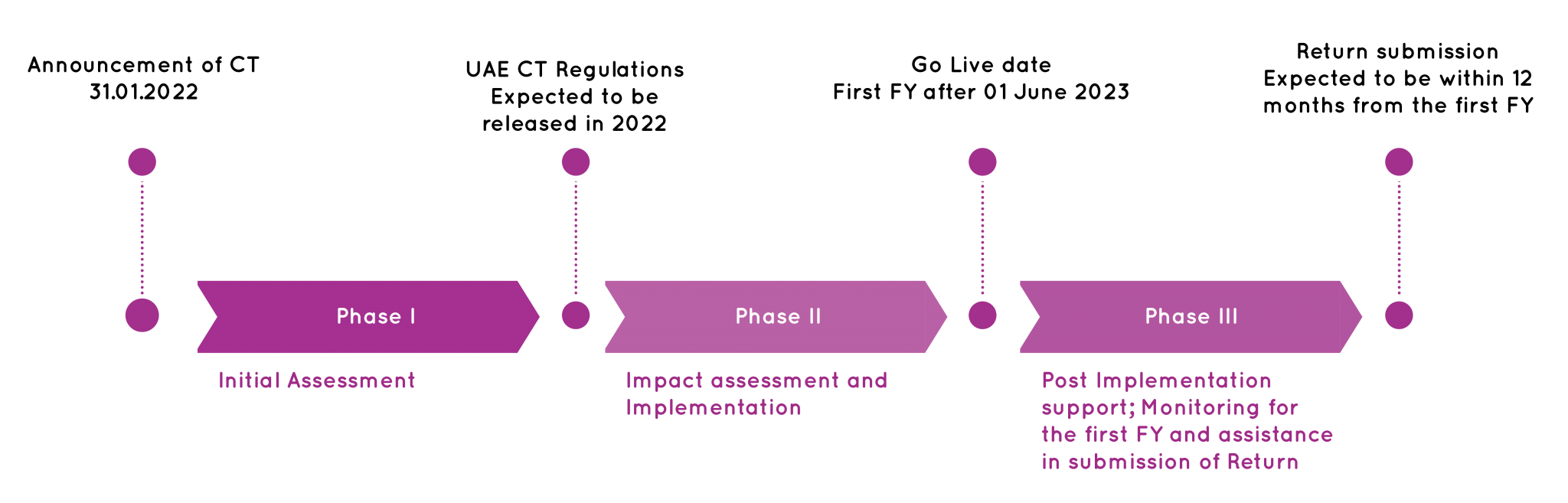 PHASE 1 – PRELIMINARY While regulations are yet to be released, our tax experts will assist you in reviewing your current business lines and flag the potential impact based on the information available. We can also highlight key pointers you should study when regulations are available. PHASE 2 – IMPACT ANALYSIS Post-release of the regulations, our tax experts can help you assess the impact of regulations on your business and re-confirm our findings from our initial assessment. Detailed analysis of regulations to provide Tax optimization techniques and strategy for implementation. Our Finance and Tax experts can help you adapt or implement accounting systems, policies, and procedures required to Go-live. PHASE 3 – CORPORATE TAX Our Finance and Tax experts can work closely with your internal finance team to review your books of accounts on a periodical basis and ensure the application of the suggested strategy, policies, and procedures. Our team will also be able to assist you in assessing the tax payable and submitting returns to the authority.
